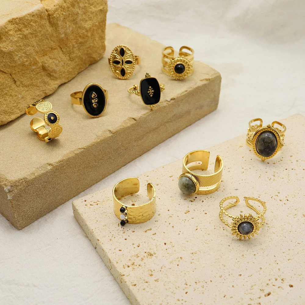 L’anello aperto donna in acciaio oro con pietra nera è un gioiello regolabile dal design essenziale con un tocco punk e vintage. Perfetto per aggiungere carattere a look casual o eleganti.