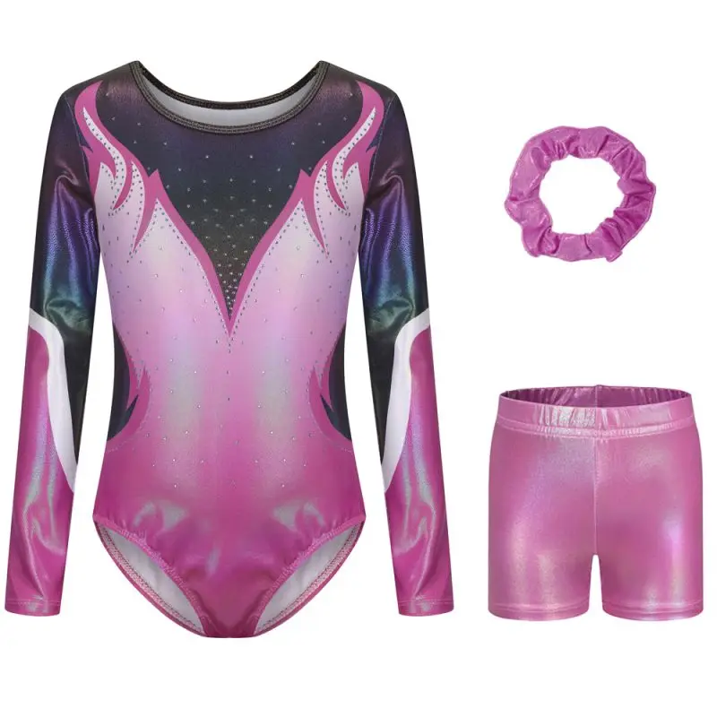 Questo body da bambina maniche lunghe è perfetto per danza, ginnastica e pattinaggio. Include pantaloncini coordinati e fascia per capelli scintillante per un look completo.
