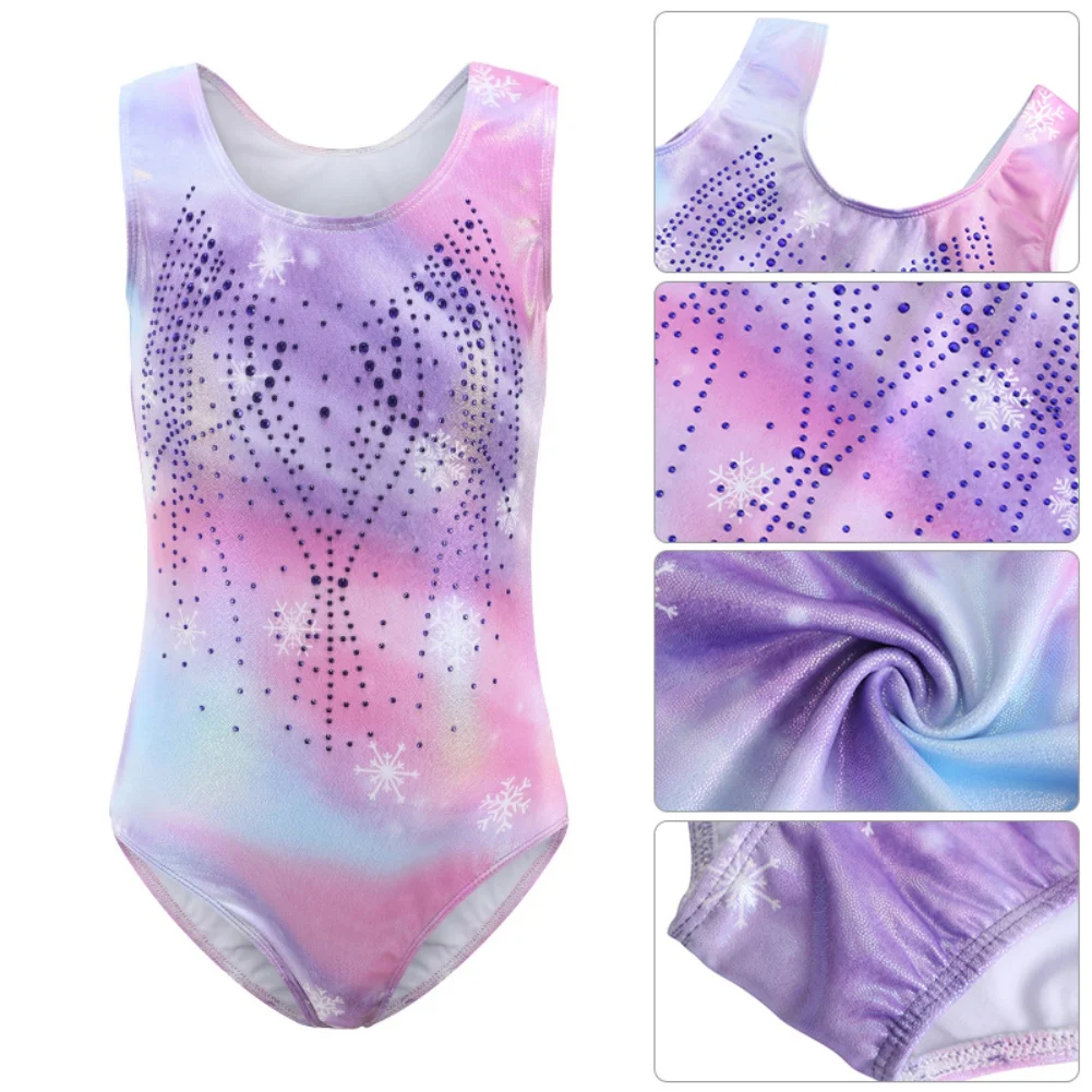 Il body danza bambina senza maniche con stampa fiocchi di neve è ideale per lezioni di danza, ginnastica e spettacoli.