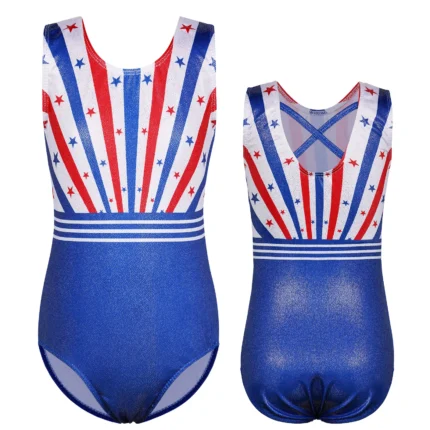 Il body ginnastica bambina senza maniche con stelle e righe è pensato per allenamenti e spettacoli di danza o ginnastica.
