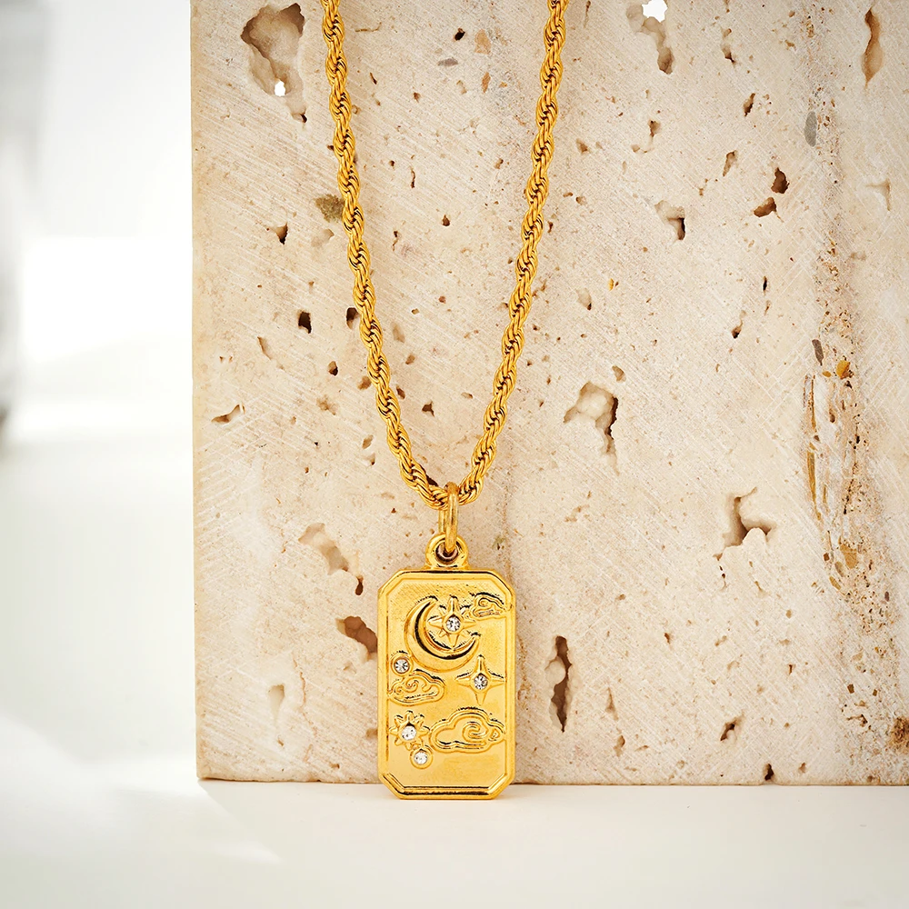 La collana tarocchi vintage in acciaio dorato è un accessorio elegante con ciondolo quadrato inciso a tema sole, luna e