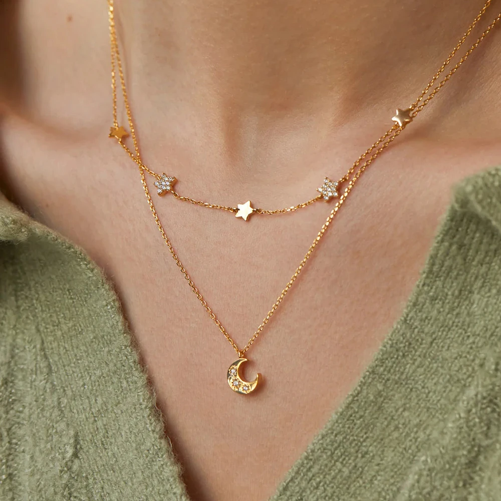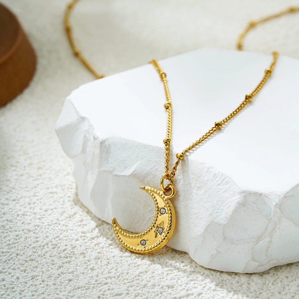 La collana donna luna e stella in acciaio inox dorato è un gioiello semplice e versatile, ideale per l’uso quotidiano. Il ciondolo a mezzaluna con piccola stella CZ aggiunge un tocco luminoso e femminile.
