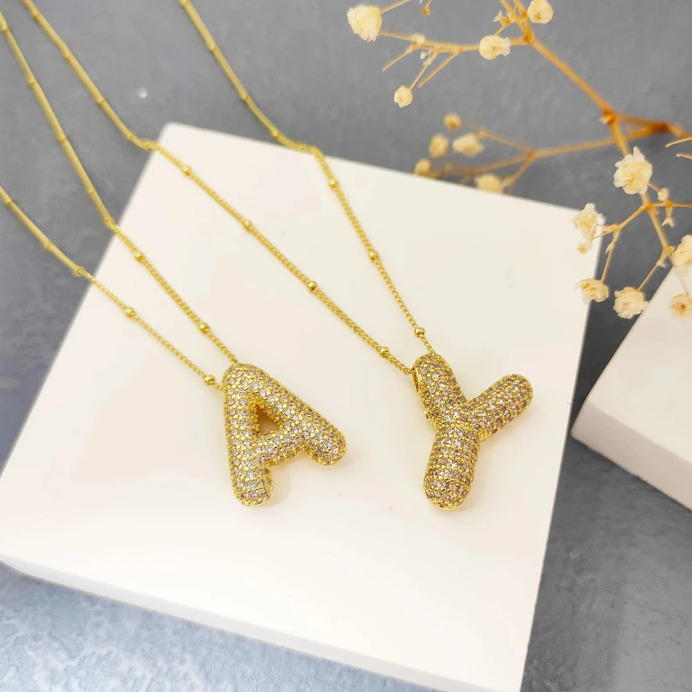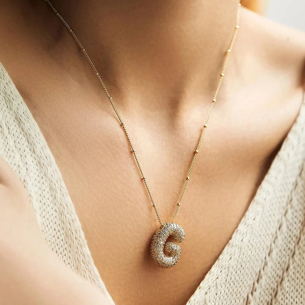 La collana iniziale placcata oro con zirconi lucenti è un gioiello semplice e distintivo, ideale per personalizzare il tuo look. La lettera in stile “bubble” è impreziosita da zirconi che riflettono la luce, perfetti per dare un tocco brillante a ogni outfit.