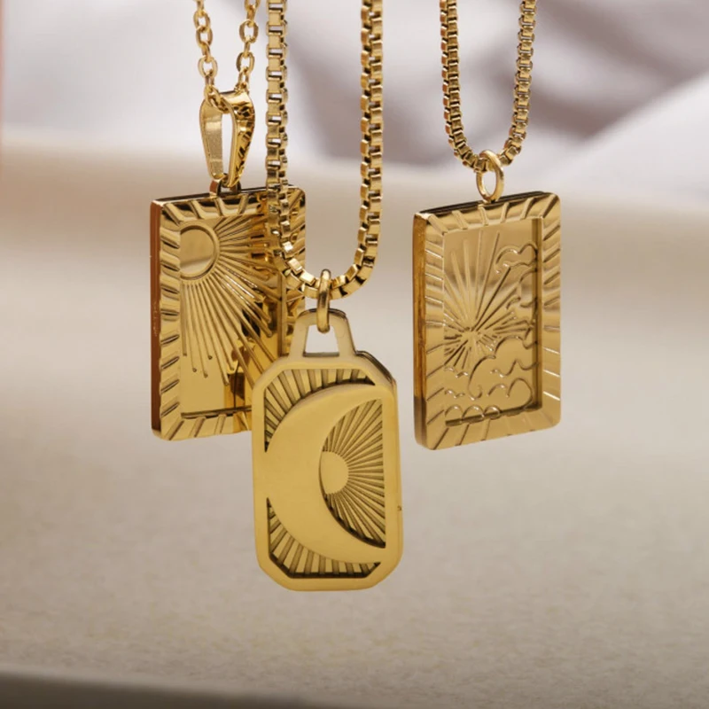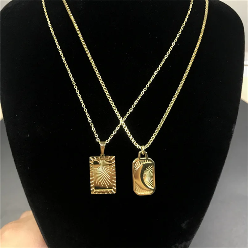 La collana sole luna in acciaio inox è un gioiello dal design rettangolare intagliato in stile vintage, ideale per l’uso quotidiano.