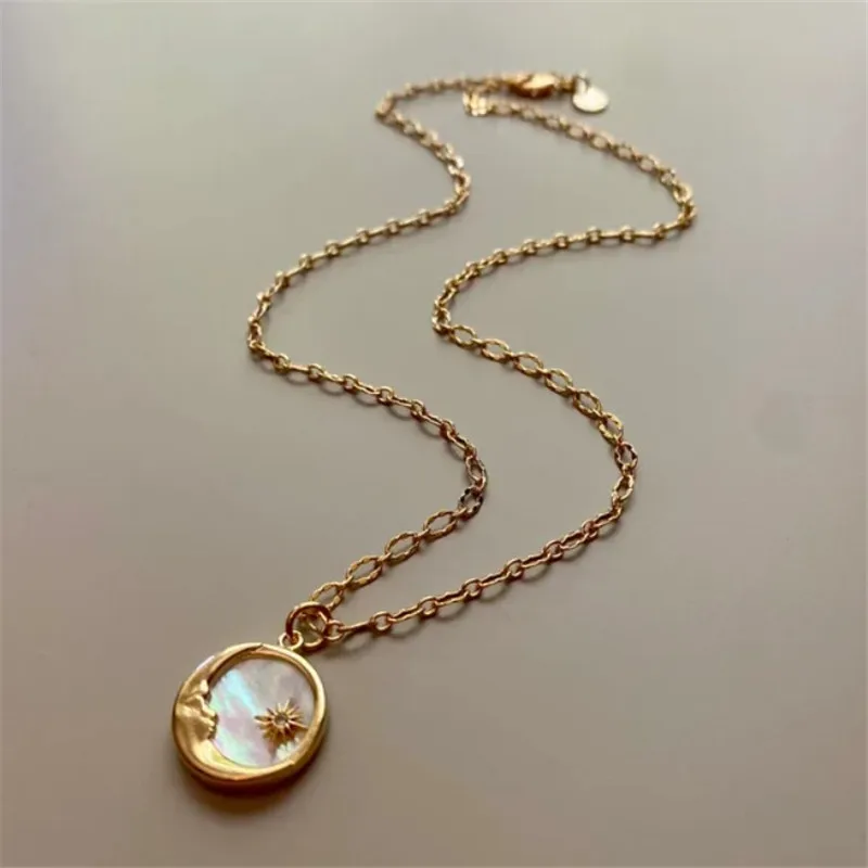 La collana vintage sole e luna con pendente a conchiglia è un gioiello elegante in acciaio inossidabile, ideale per l’uso quotidiano e le occasioni speciali.