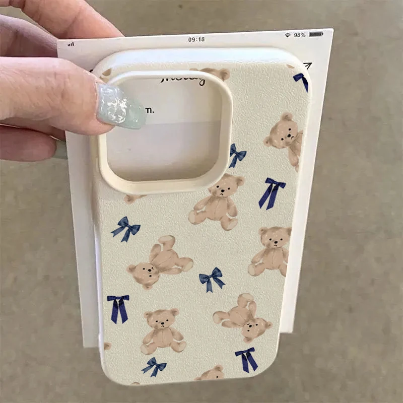 La cover orsetto con fiocco per Xiaomi protegge il tuo smartphone con una custodia antiurto dalla simpatica grafica a orso e finitura effetto lychee.
