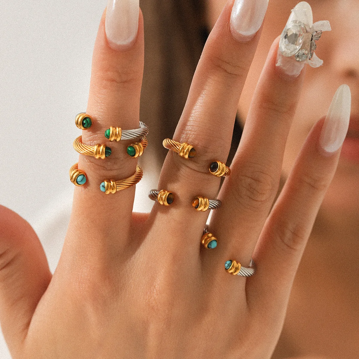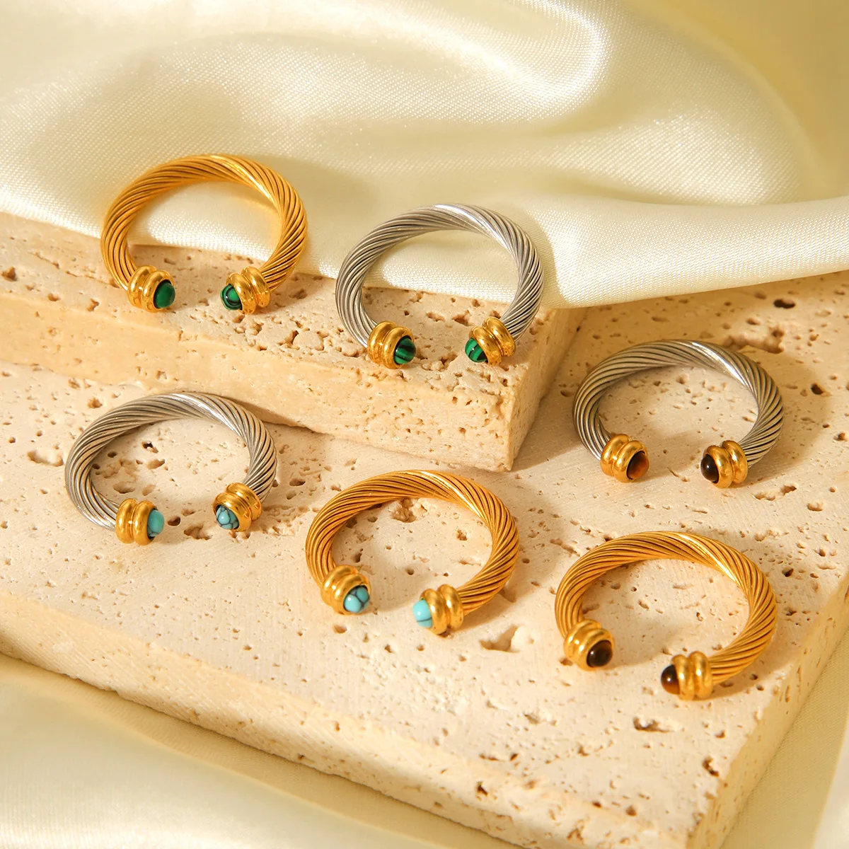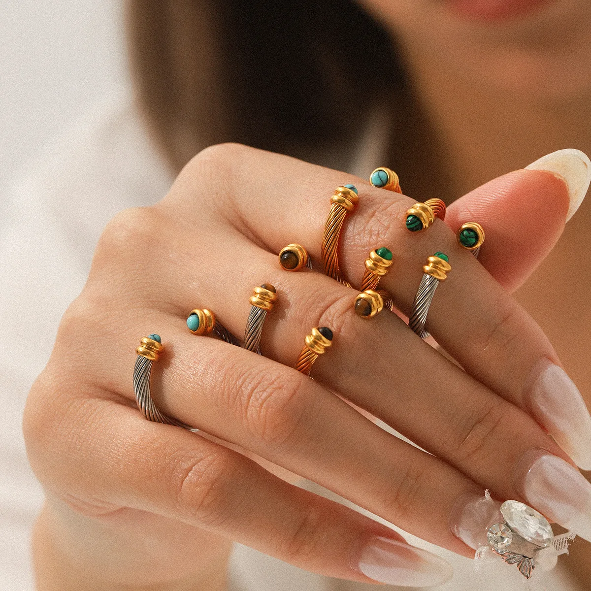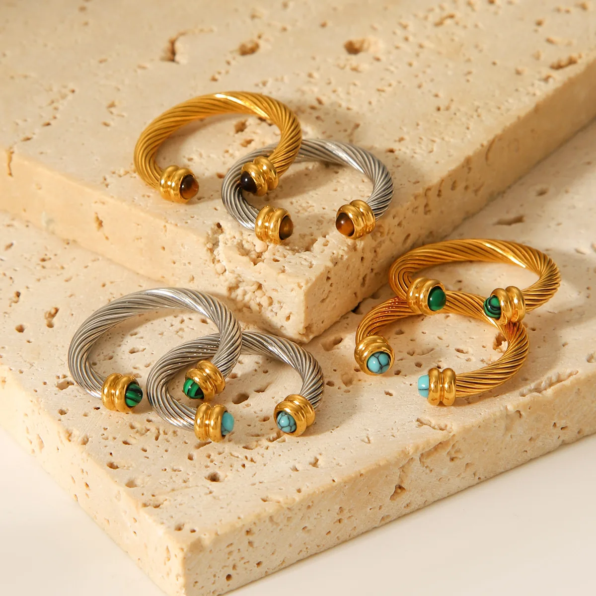 Un gioiello dal fascino senza tempo: questo anello aperto con texture a spirale combina la bellezza della pietra turchese con la forza dell’occhio di tigre. Placcato in oro 18K, è un accessorio versatile e di qualità, perfetto come regalo speciale o gioiello di coppia.