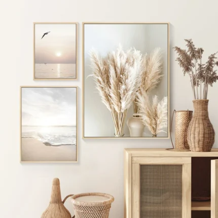 Questo set di 3 stampe mare beige su tela raffigura onde, spiaggia e paesaggi naturali, ideale per arredare soggiorno, camera