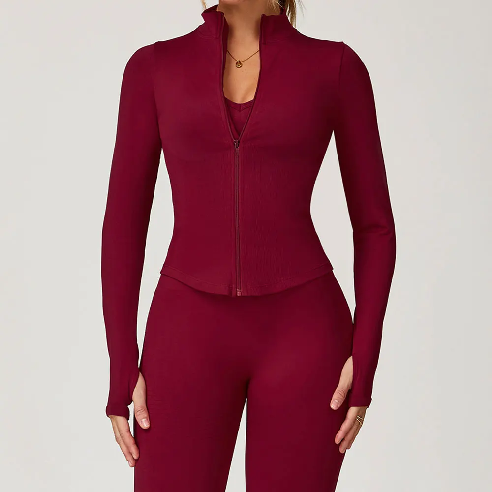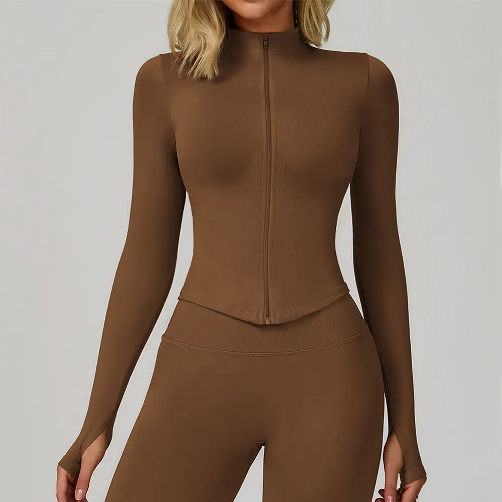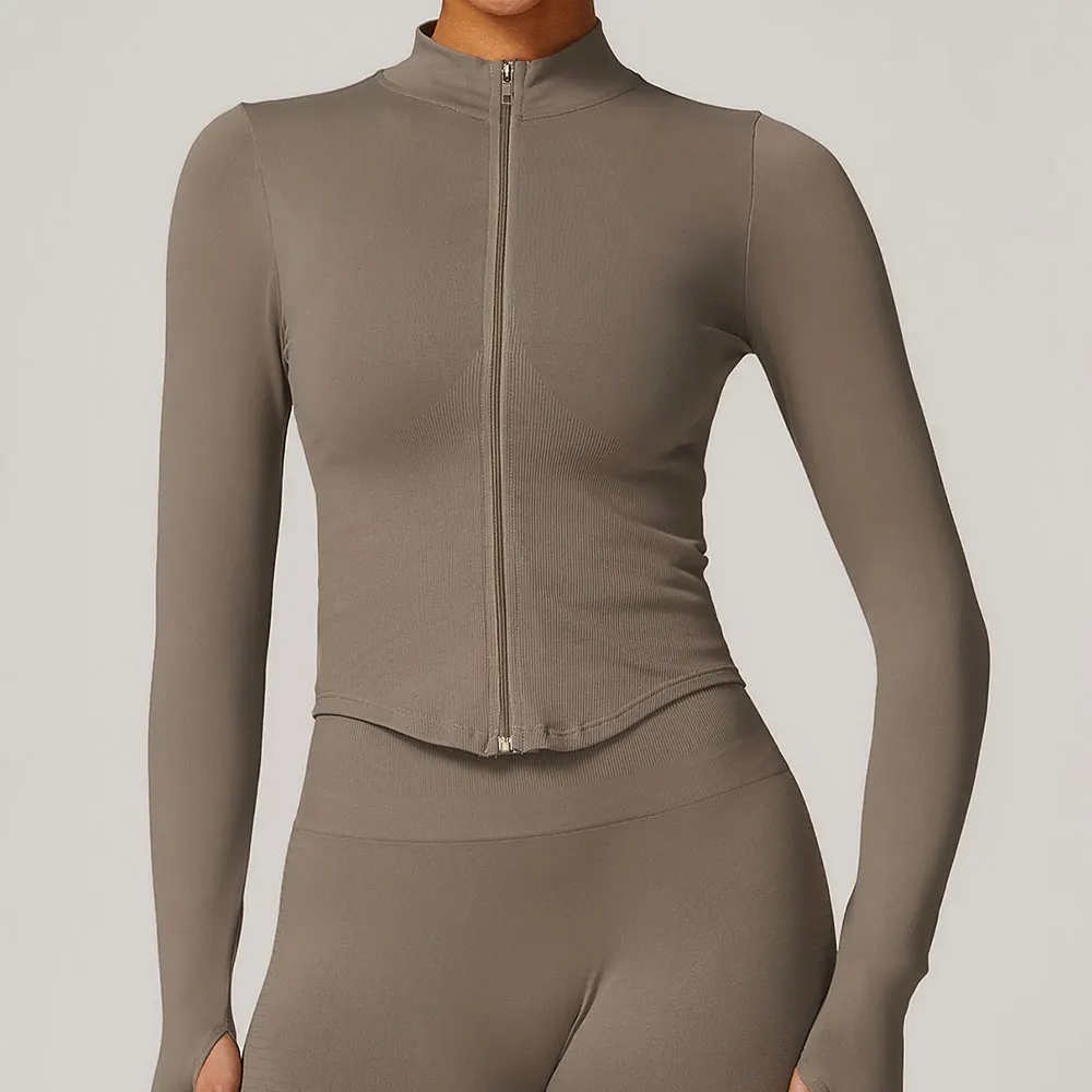 Giacca sportiva da donna a manica lunga con zip frontale, ideale per yoga, palestra, corsa e allenamento. Morbida e aderente, offre sostegno leggero e libertà di movimento.