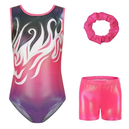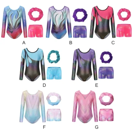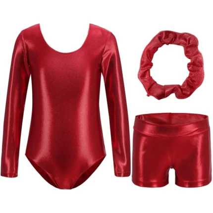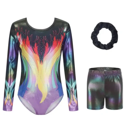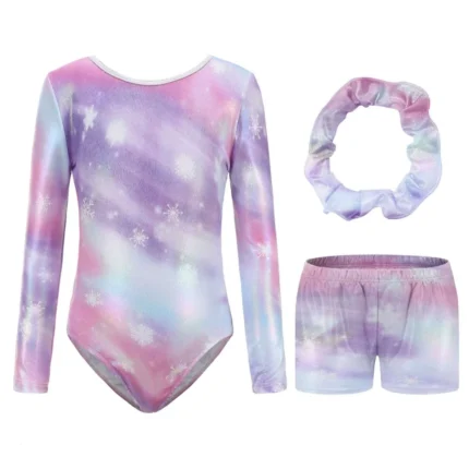 Questo body da bambina maniche lunghe è perfetto per danza, ginnastica e pattinaggio. Include pantaloncini coordinati e fascia per capelli