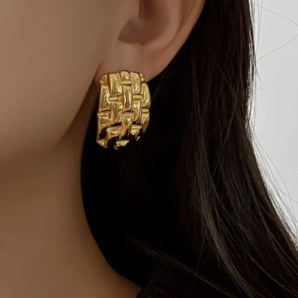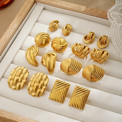 Gli orecchini a bottone geometrici in acciaio dorato 18K sono piccoli gioielli dallo stile moderno e raffinato, ideali per l’uso