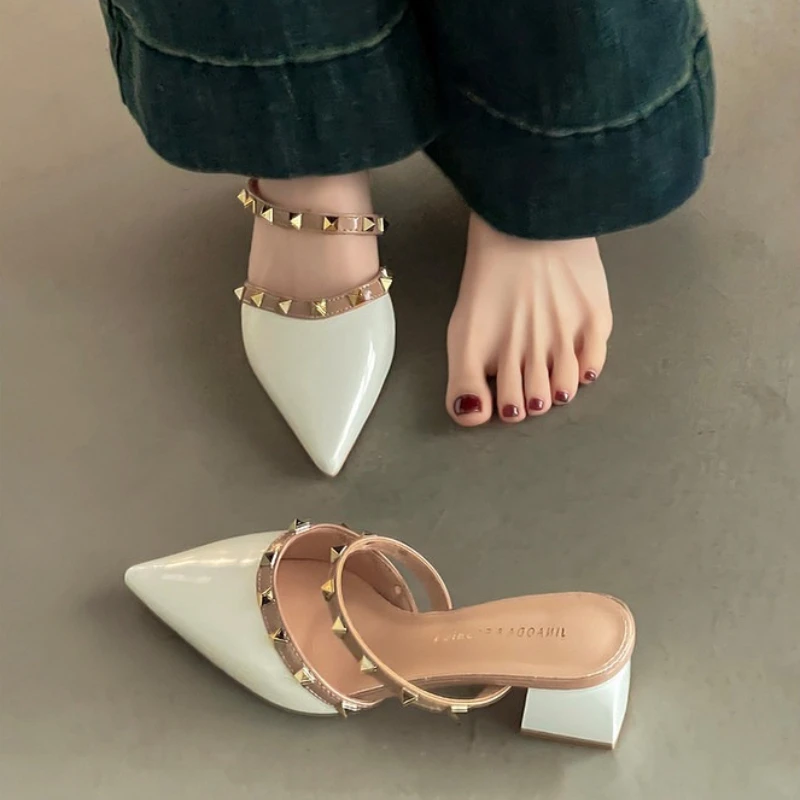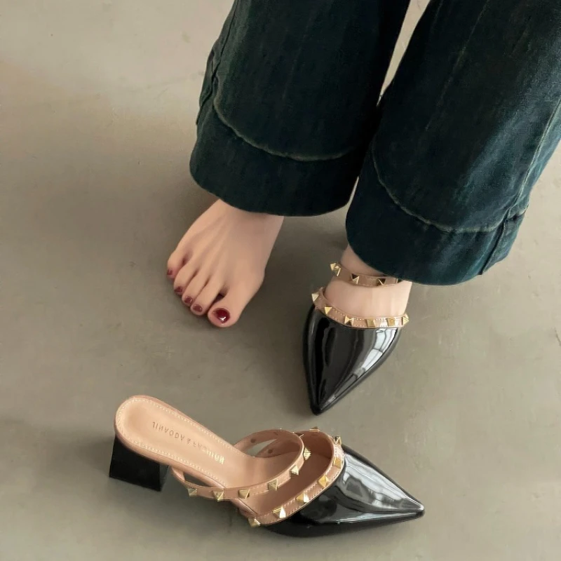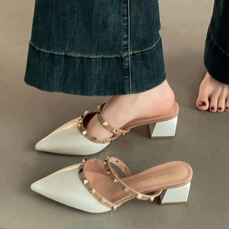 Le mules da donna con tacco grosso e rivetti sono sandali aperti sul retro, ideali per look da sera e outfit urbani. La punta affusolata e i dettagli metallici donano uno stile moderno e deciso, mentre il tacco largo offre maggiore stabilità. Perfette con jeans, pantaloni eleganti o abiti midi per un tocco chic senza rinunciare al comfort. Consigliate per serate estive, uscite in città e occasioni informali ma curate.