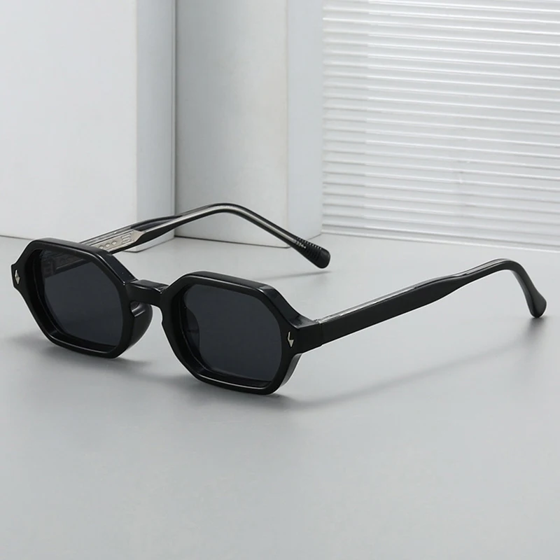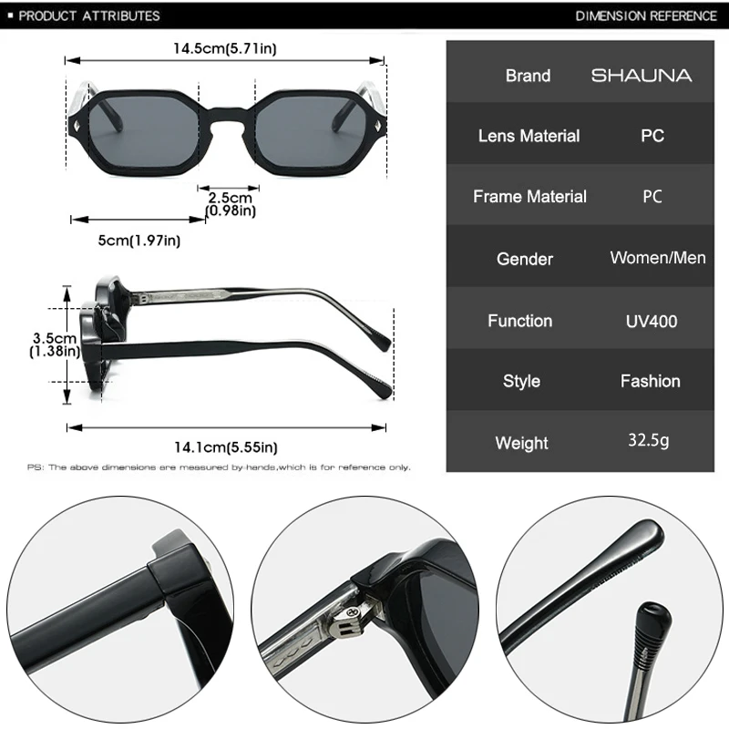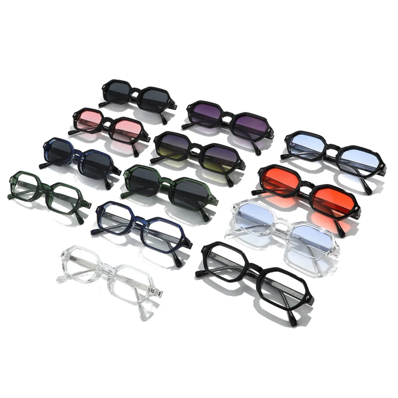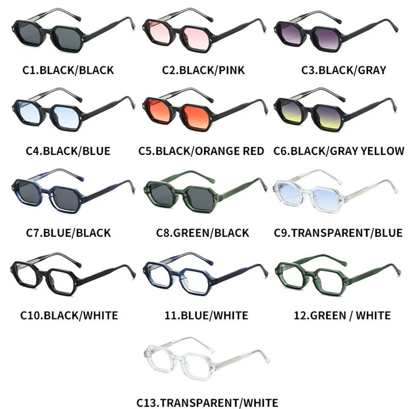 Gli occhiali da sole poligonali unisex con lenti sfumate UV400 offrono uno stile retrò moderno e protezione affidabile per gli occhi. La montatura geometrica con dettagli a rivetto dona carattere al look quotidiano, mentre le lenti trasparenti sfumate garantiscono comfort visivo.