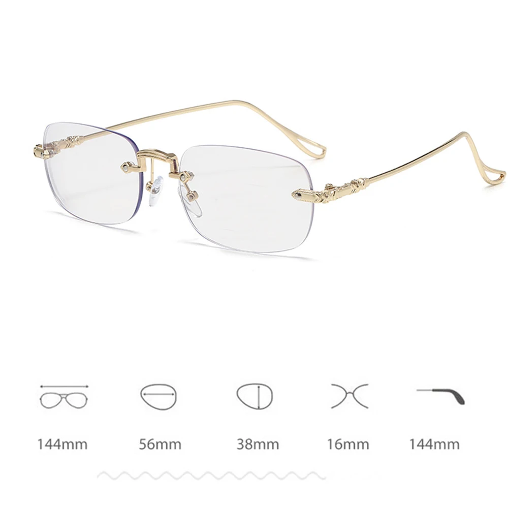Gli occhiali fotocromatici anti luce blu senza montatura unisex proteggono gli occhi durante l’uso di pc, smartphone e all’aperto. Le lenti filtrano la luce blu e si scuriscono alla luce del sole, offrendo comfort in interno ed esterno.