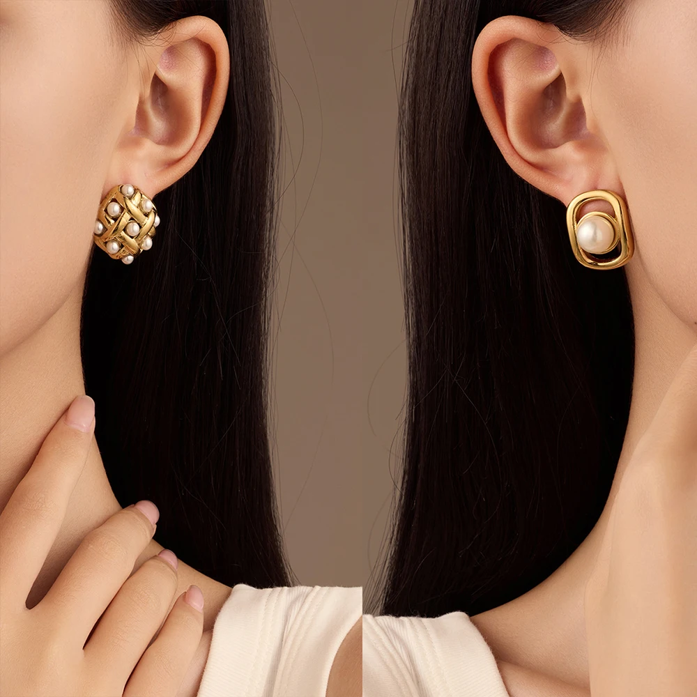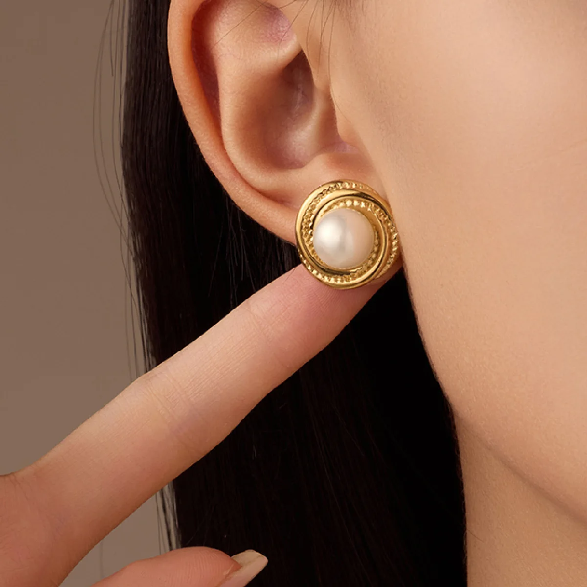 Gli orecchini a bottone in acciaio con perla e motivo geometrico sono accessori eleganti per l’uso quotidiano e le occasioni speciali.