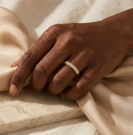 Questo anello minimalista in oro 18K con mezze zirconie cubiche è un gioiello elegante per tutti i giorni e per