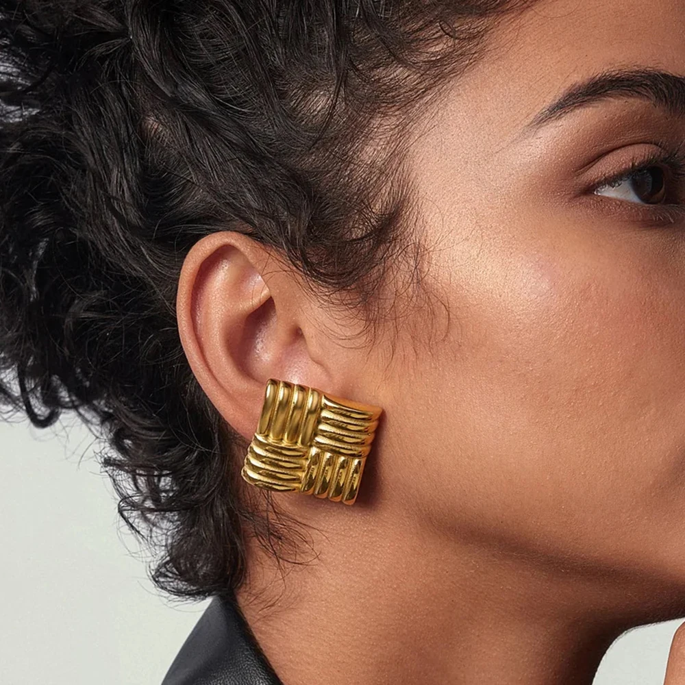 Gli orecchini a bottone donna onda twist sono gioielli minimalisti con design geometrico e finitura placcata oro 18K. Perfetti per