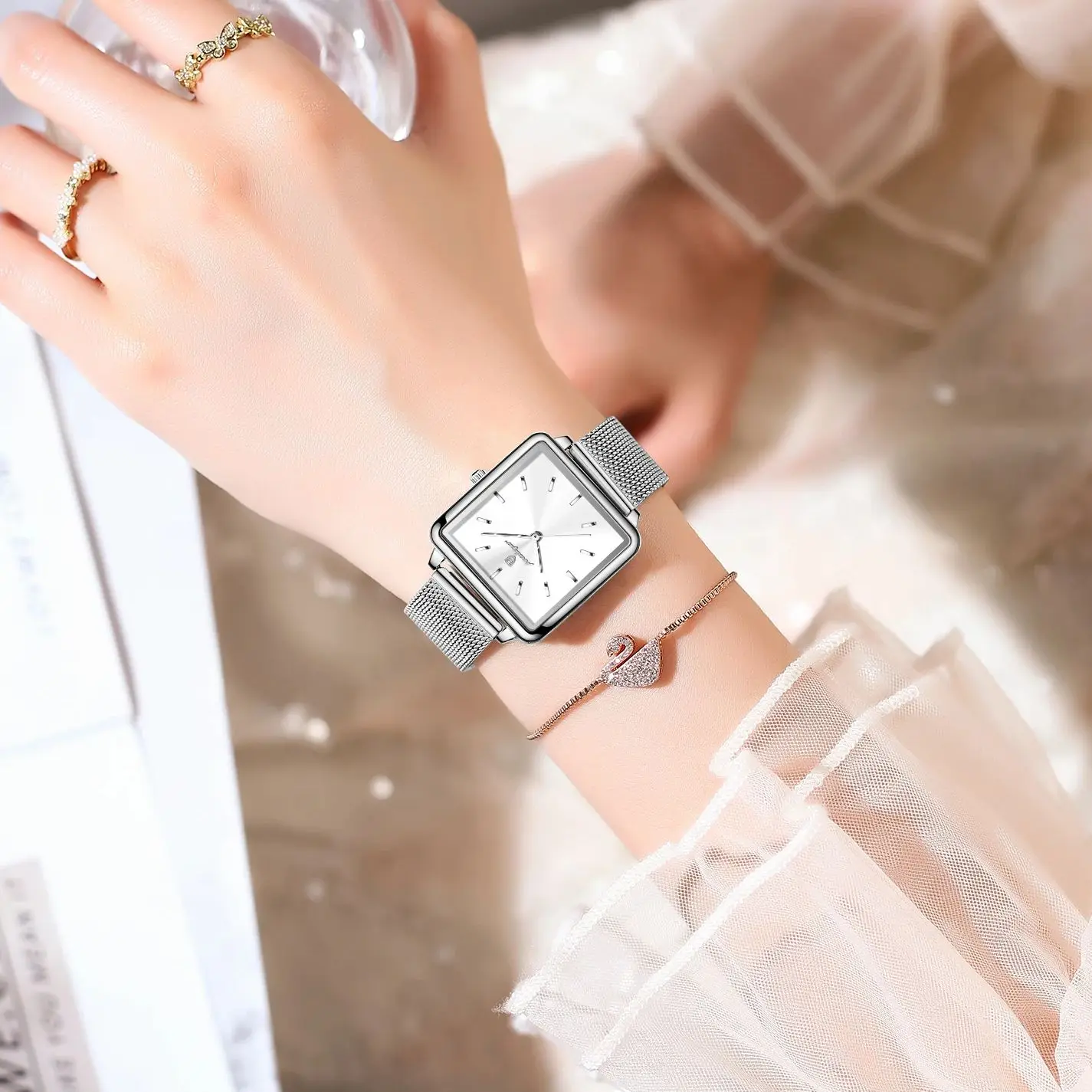 L’orologio da donna elegante in acciaio è un accessorio raffinato per tutti i giorni. Il design con quadrante quadrato e cinturino a maglia in acciaio inox si adatta sia a look casual che formali.