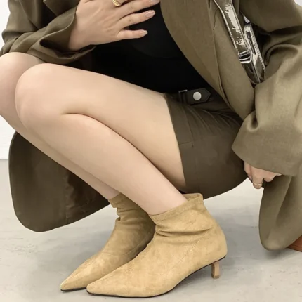 Gli stivaletti calzino donna in pelle scamosciata uniscono comfort e stile per la mezza stagione. Design essenziale, tacco basso e