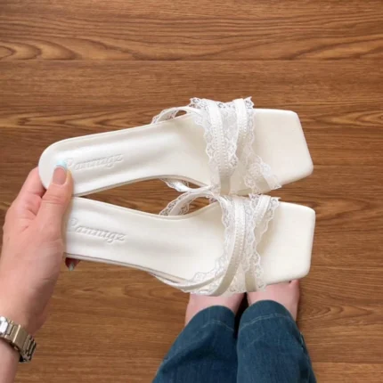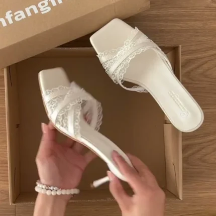 Le ciabatte da donna in pizzo con tacco sottile sono sandali eleganti con punta aperta, ideali per cerimonie, feste ed