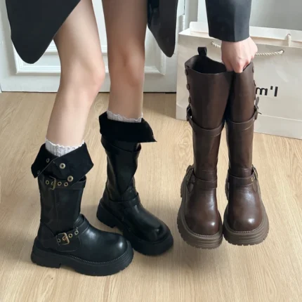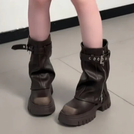 Questi stivaletti donna platform vintage uniscono suola spessa e design corto in stile punk, ideali per l’autunno e l’inverno. Offrono
