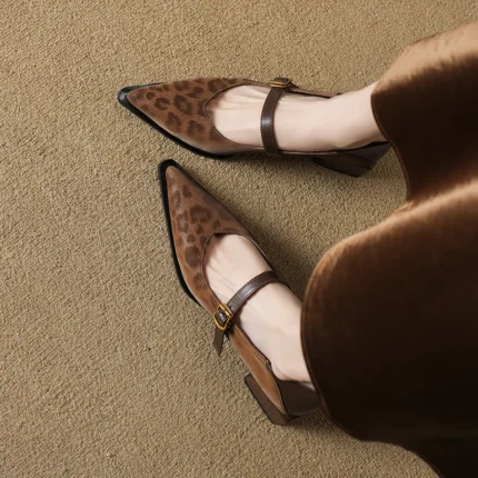Le scarpe Mary Jane donna a punta con tacco largo leopardato uniscono stile vintage e comfort quotidiano. Ideali per ufficio,