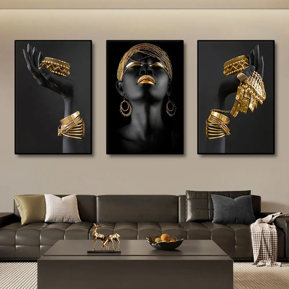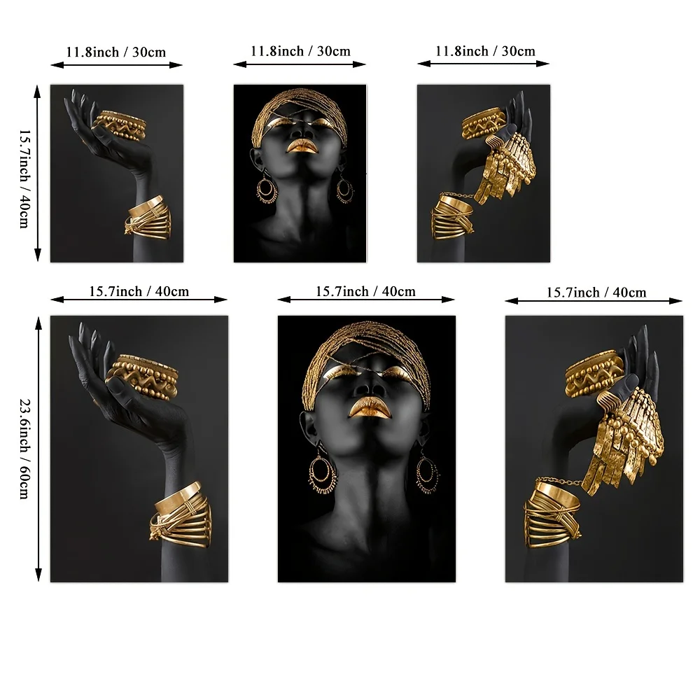 Questo set di 3 poster donna africana con gioielli dorati è ideale per decorare soggiorno, camera o studio con uno stile elegante e contemporaneo. Le stampe su tela donano profondità ai colori e valorizzano i dettagli dei gioielli.
