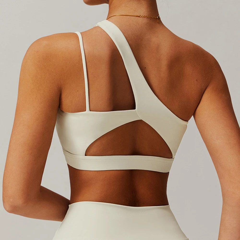 Top sportivo da donna con spalla obliqua, ideale per yoga, palestra e corsa. Offre sostegno e libertà di movimento con un design che valorizza la schiena.