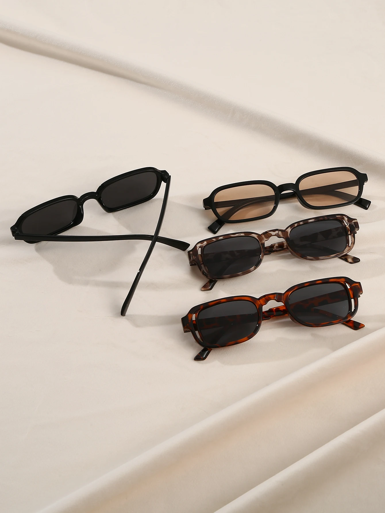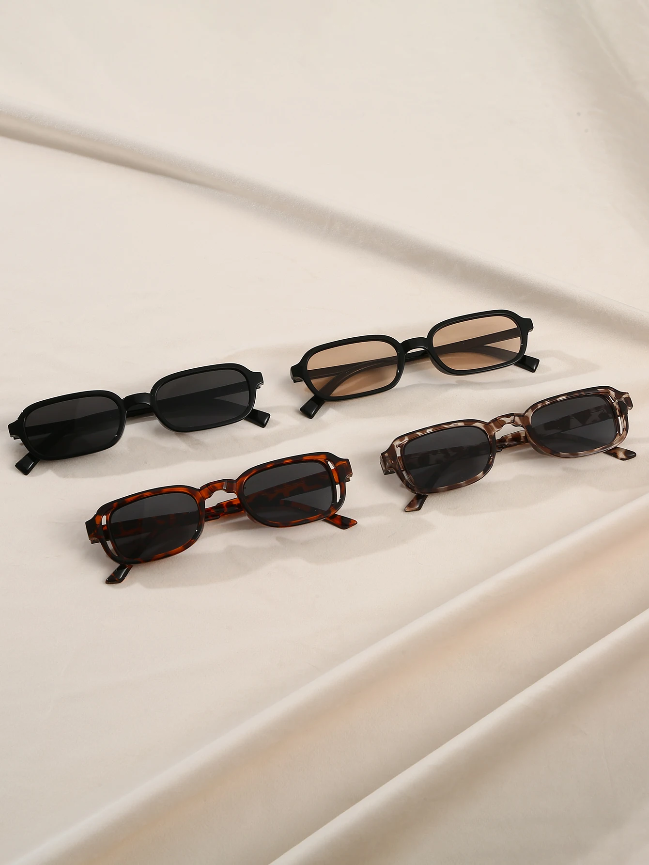 Il set di 4 occhiali da sole rettangolari piccoli donna offre montature compatte e leggere in diversi stili, tra cui nero classico e stampa leopardata. Ideali per dare un tocco moderno ai tuoi outfit di tutti i giorni.