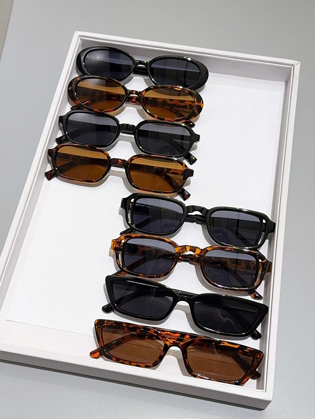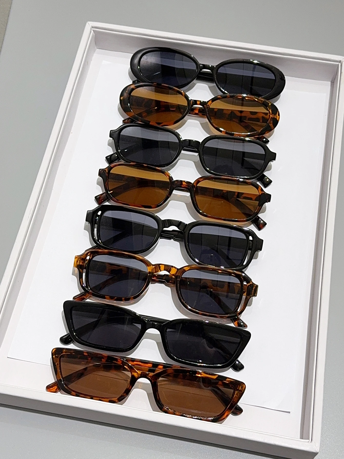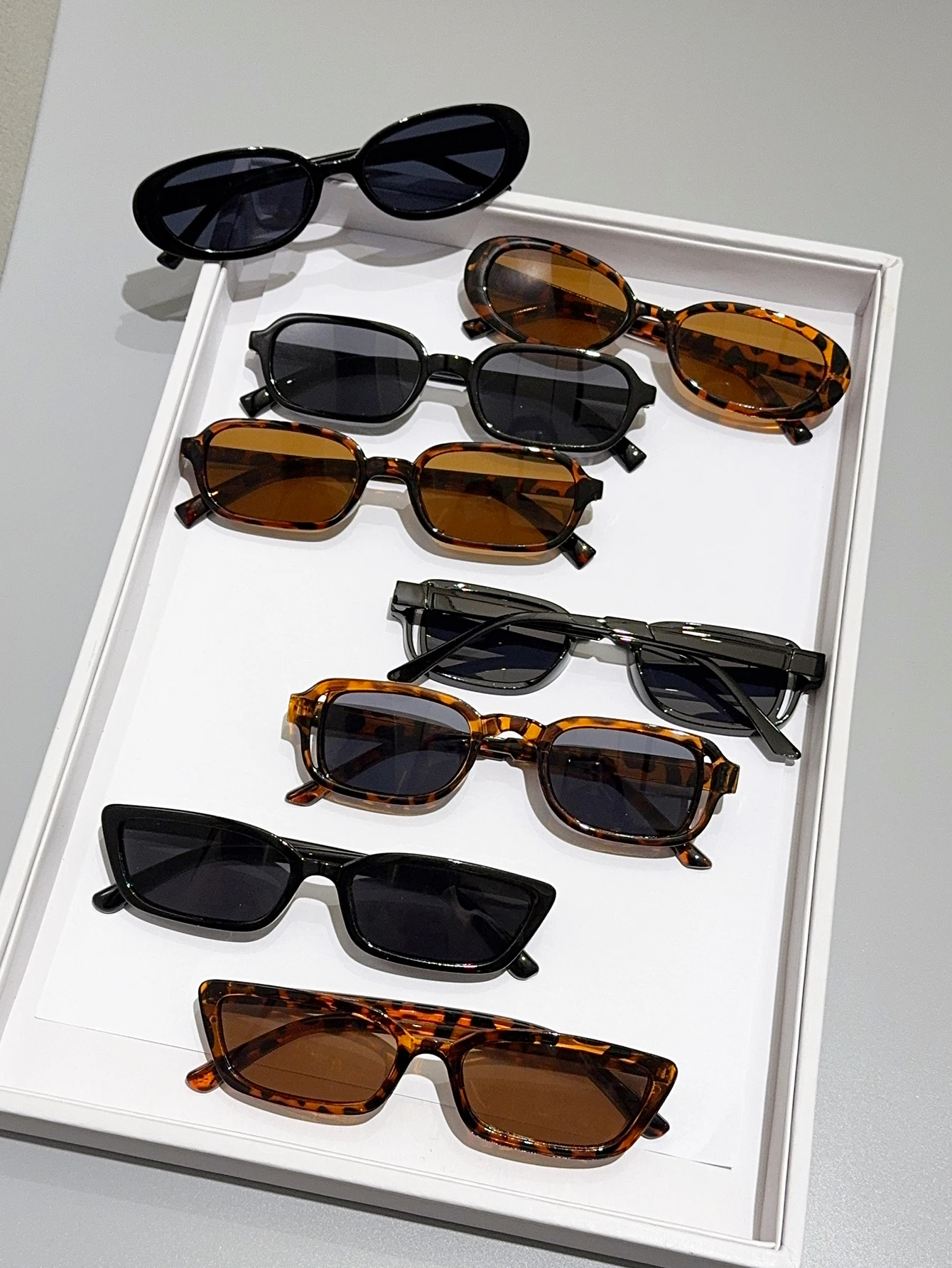 Set di 8 occhiali da sole piccoli con montature nere e tartarugate, ideali per l’uso quotidiano, guida e feste.