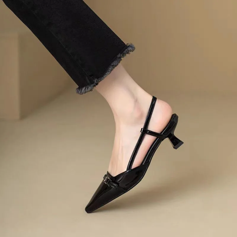Tacchi slingback donna in pelle verniciata con punta chiusa, ispirati allo stile francese. Ideali per aggiungere un tocco elegante ai look di tutti i giorni e alle occasioni speciali.