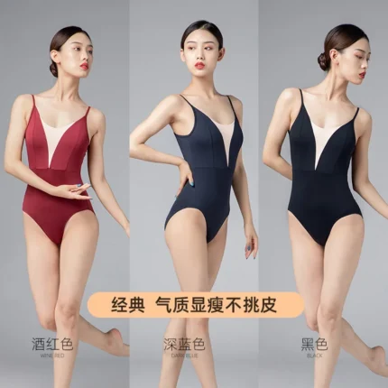 Questo costume body danza donna con scollo a V e spalline sottili è pensato per lezioni di balletto, ginnastica e