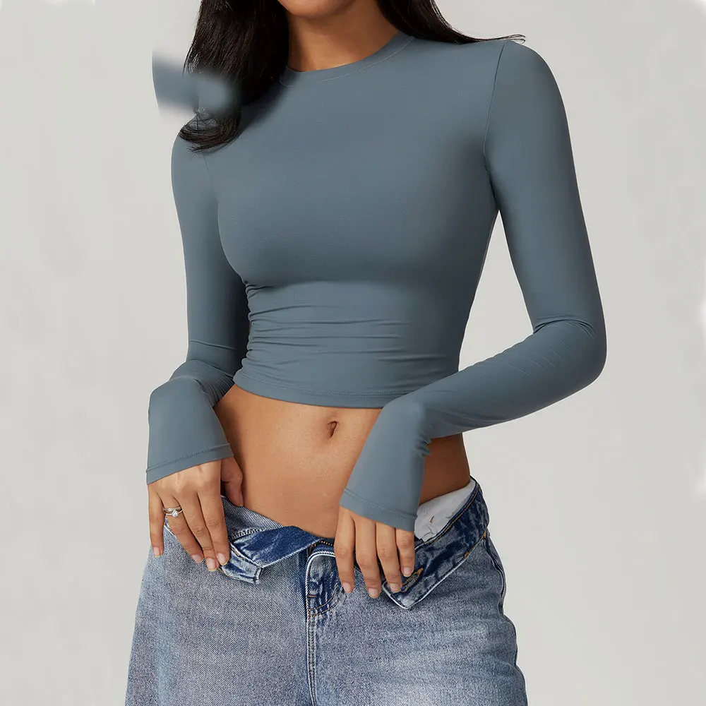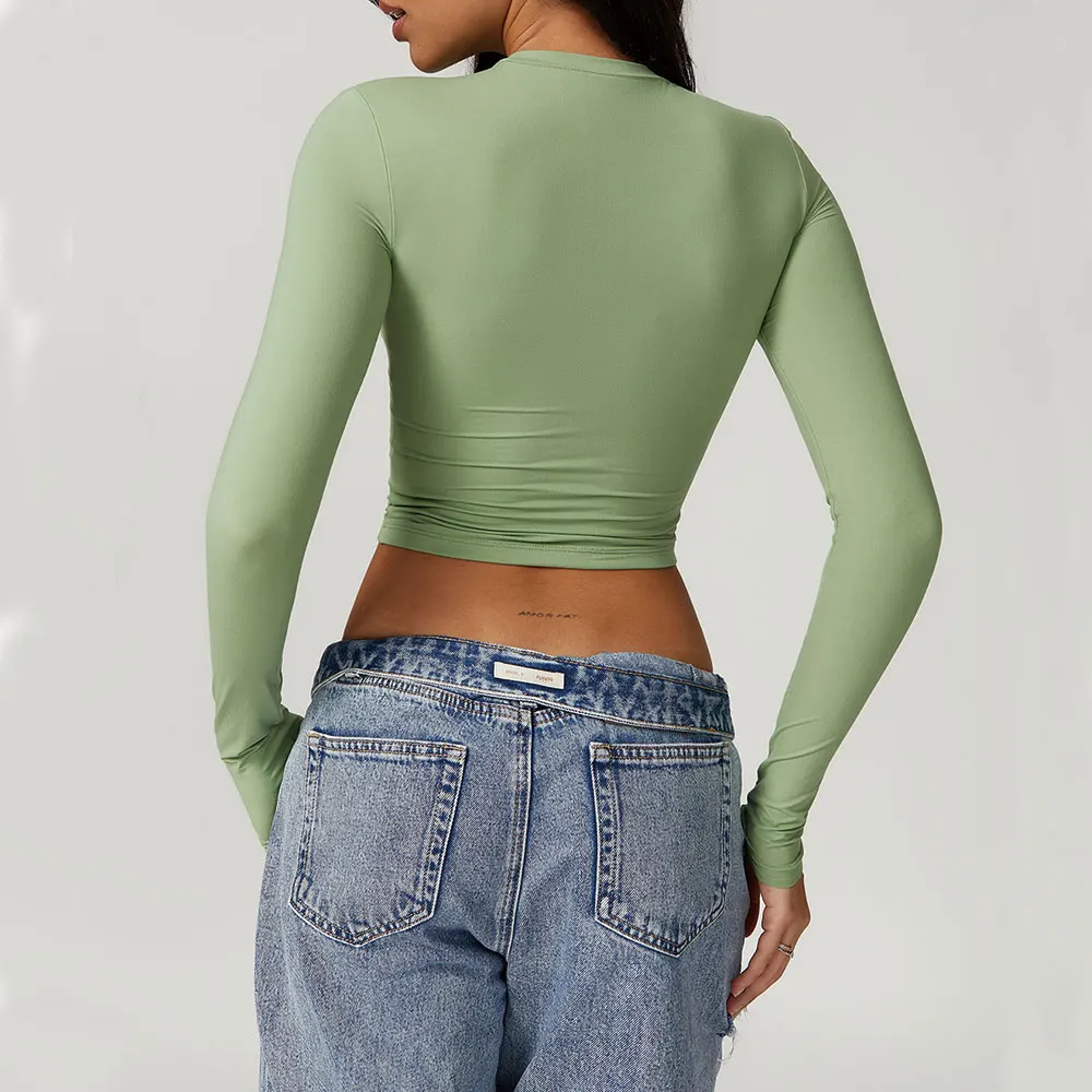 Top tecnico da donna a maniche lunghe, aderente e traspirante, pensato per allenamenti in palestra, yoga, corsa e ciclismo.